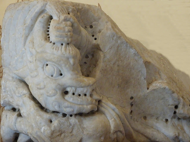 que soportan el friso, representan cabezas humanas cuya labra es atribuida al
